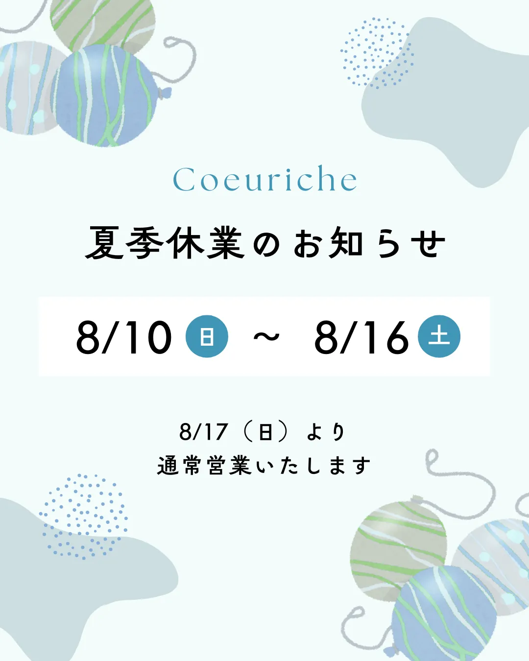 【夏季休業のご案内】2025/8/10~8/16までは休業日となります。
